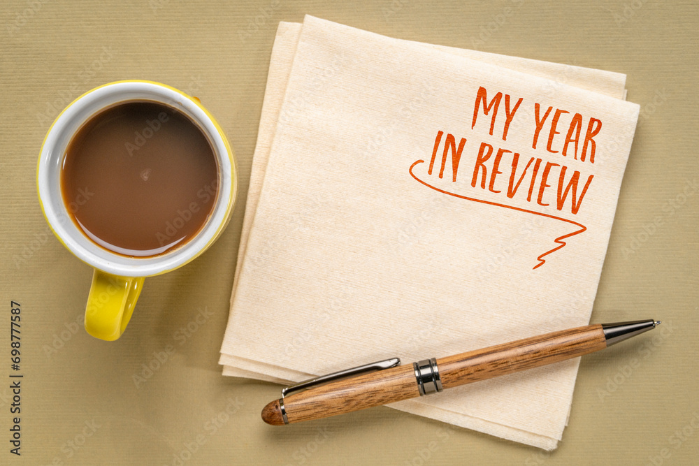 my year in review - a note on a napkin with coffee, end of year personal exeperience and story concept
