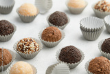 Typical Brazilian sweet brigadeiro. Assorted flavors of candies on a white table. Pattern