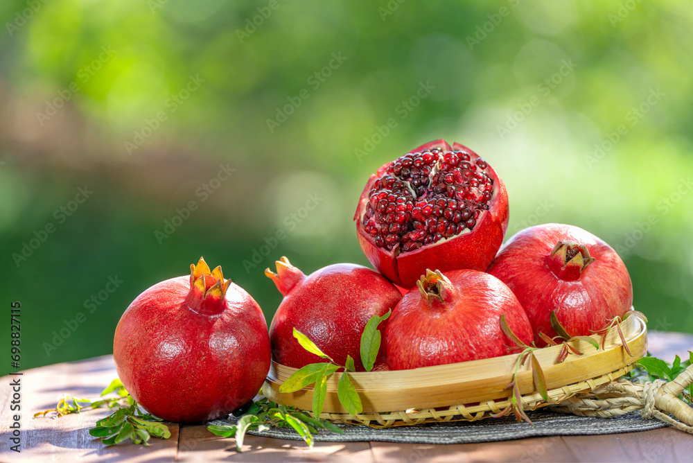 Pomegranate in wooden basket on wooden table in garden, Pomegranate with slices on blurred greenery background.