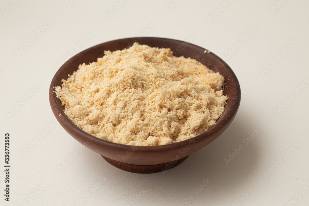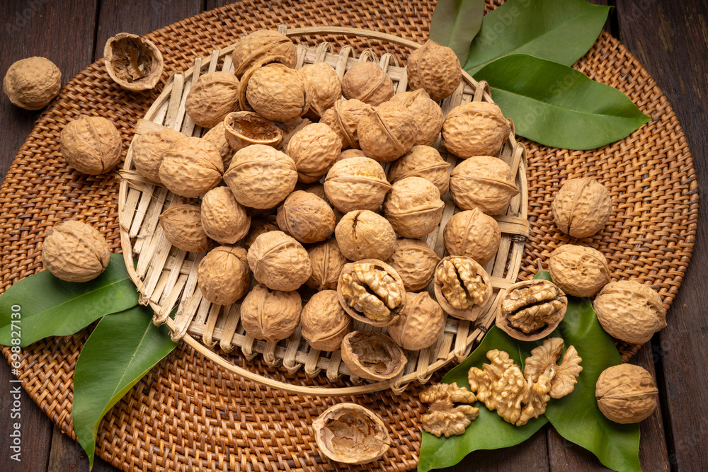 Walnuts in wooden bowl on wooden background, Walnuts kernels in wooden basket on wooden table.