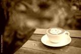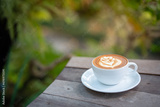 Hot art Latte Coffee. Background Coffee cup and beans on old kitchen table.