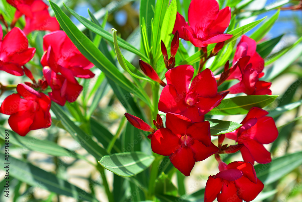 Tropical red flower on a branch with green leaves. Oleander close-up. Botanical garden. Natural background. Beauty in nature.