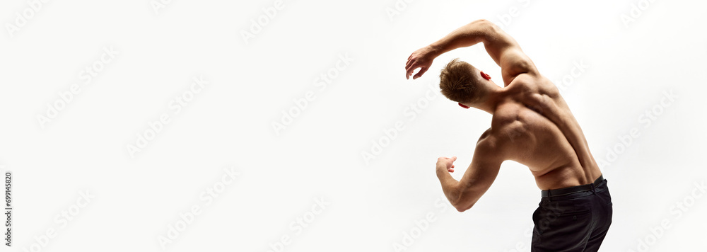 Shirtless young man with relief, strong, healthy, muscular back standing shirtless in pants isolated on white studio background. Concept of beauty, body care, sport. Banner. Empty space to insert text