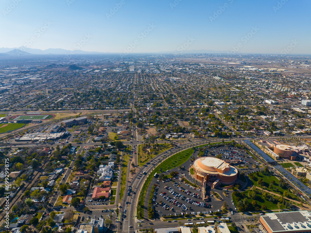 Arizona State University ASU including Gammage Auditorium in main campus aerial view in city of Tempe, Arizona AZ, USA.