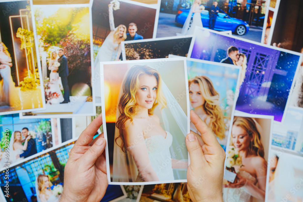men's hands lay out Beautiful printed wedding photos. Professional photography.