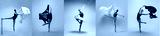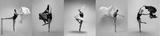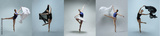 Ballerina practicing dance moves on color backgrounds, set of photos