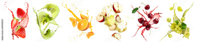 Fresh fruits with splashing juices on white background, set
