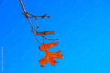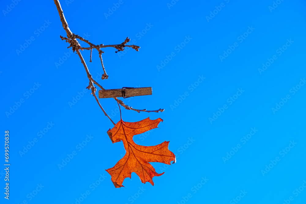 No, please leaf, dont leave. Oak leave hanged by old vintage laundry hook on the dry branch