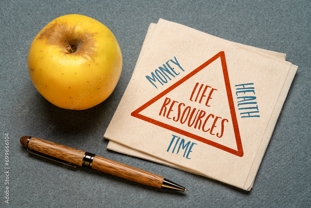 life resources - time, money and health, sketch on a napkin, lifestyle and finance concept