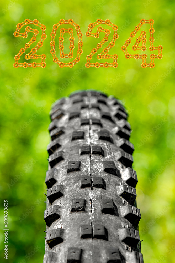 Bicycle off-road rubber tread close-up with 2024 Happy New Year made from golden chain links on green nature background