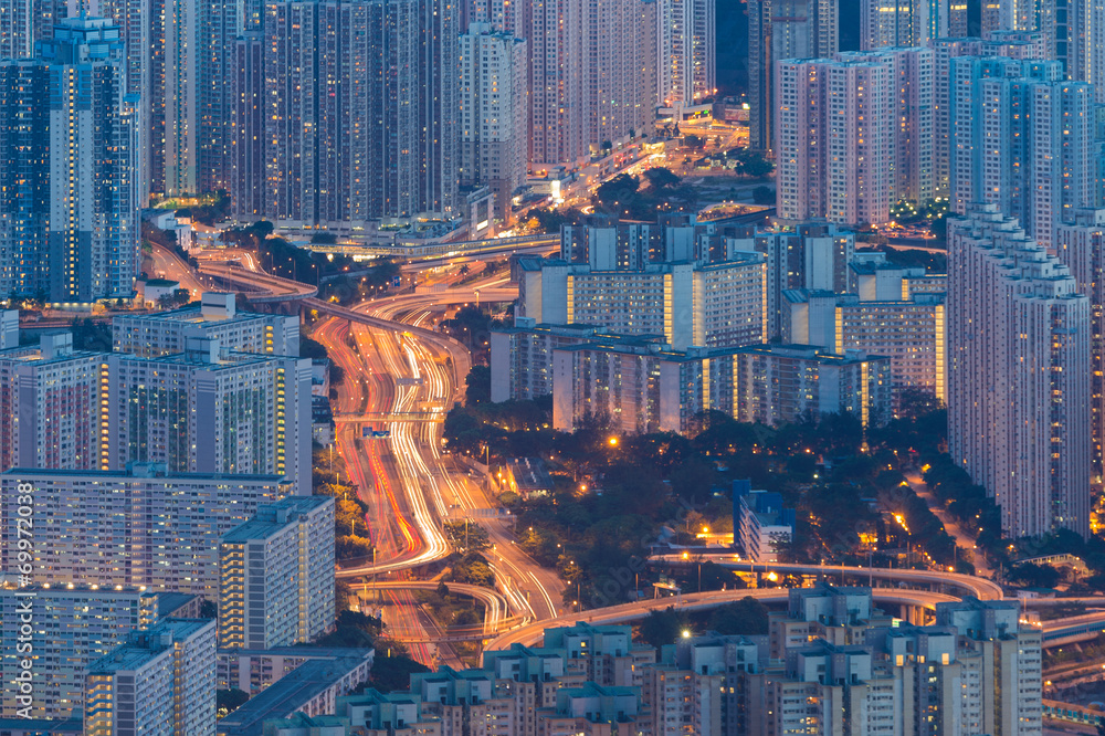 traffic light trail in overcrowded cityscape