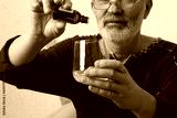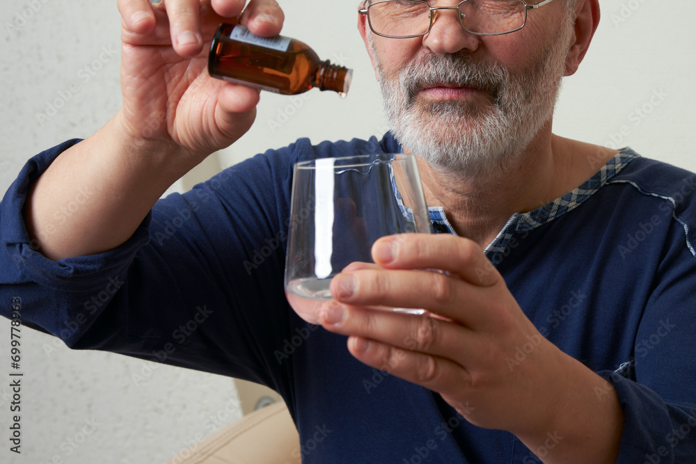 An age-matched man measures drops of liquid medicine into a glass of water for ingestion.