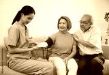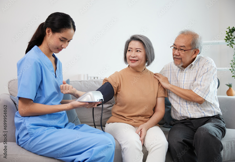 caregiver or nurse measure blood pressure to senior woman on sofa