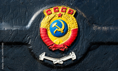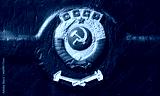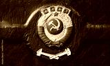 The coat of arms of the Soviet Union with a hammer and sickle, painted on iron painted black.