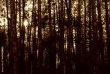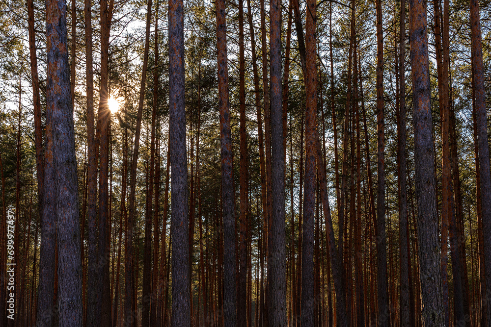 Sunset or sunrise in the spring pine forest covered with a snow. Sunbeams shining through the tree trunks.