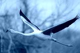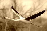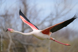 A Greater Flamingo flying low over water