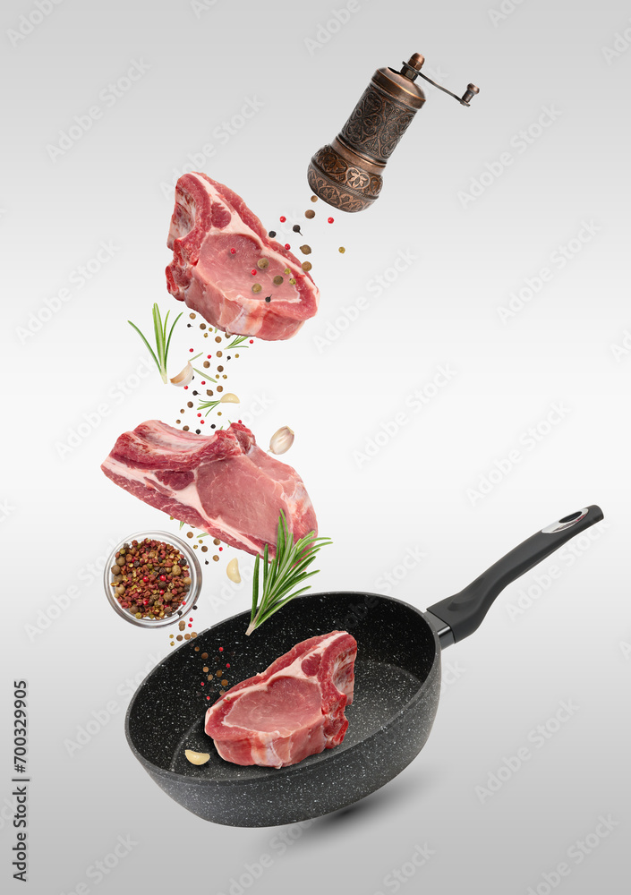 Levitating pieces of pork meat on a rib, spices. Cooking lunch
