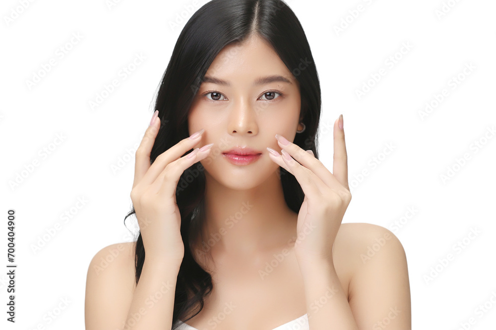 Close up face of beautiful young Asian woman with clean fresh skin isolated on Transparent background. PNG file format.