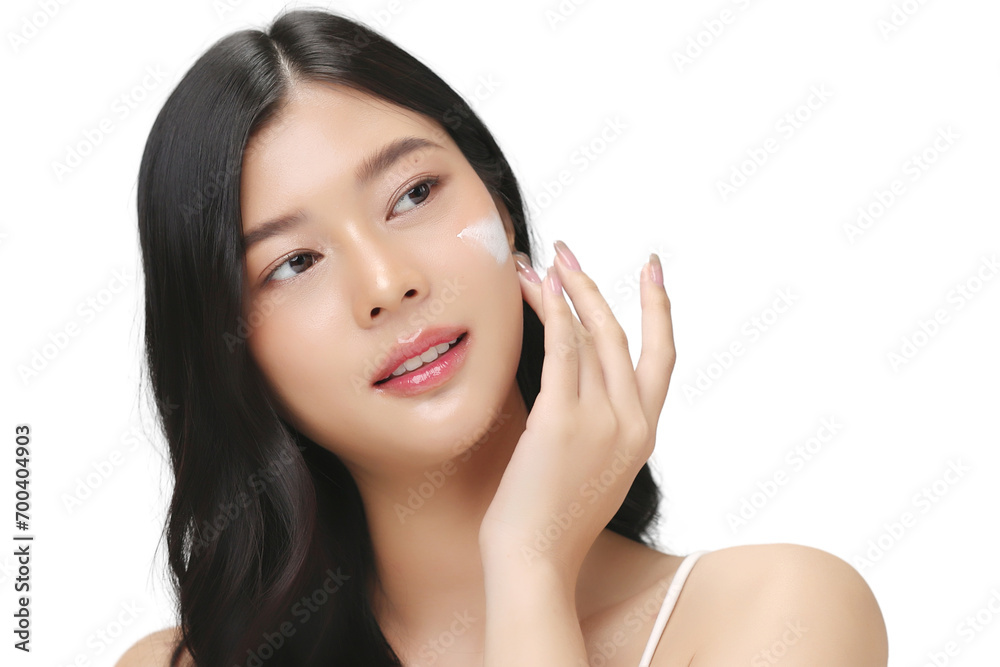 Close up face of beautiful young Asian woman with clean fresh skin isolated on Transparent background. PNG file format.