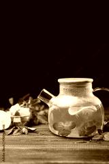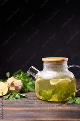 natural organic herbal tea with lemon and mint in glass teapot on a wooden table
