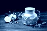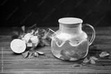 natural organic herbal tea with lemon and mint in glass teapot on a wooden table