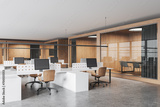 Modern office interior with coworking and glass conference boxes with furniture