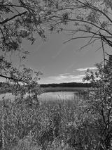 Letni krajobraz z jeziorem, lasem i błękitnym niebem w tle. Staw w Parku Krajobrazowym Dolina Baryczy, Polska