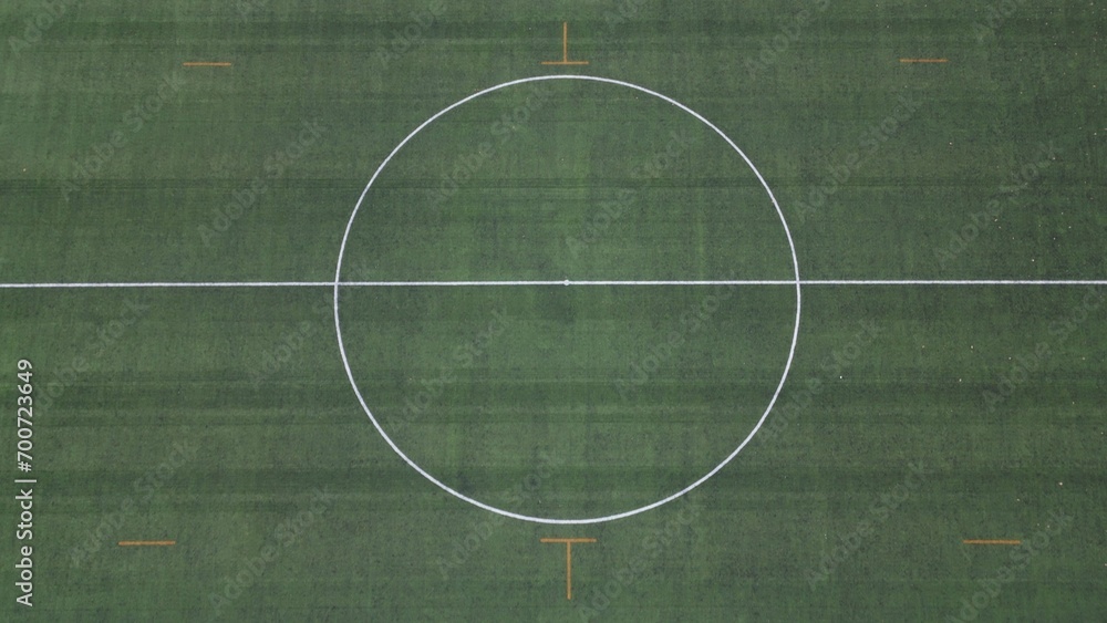 Drone aerial view of empty soccer football field without players during Covid-19 Coronavirus outbreak lockdown - sport activities