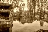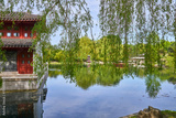 Idyllic Chinese garden with pond and terrace, on the outskirts of Berlin.