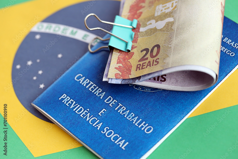 Brazilian work card and social security blue book and reais money bills on flag of Federative Republic of Brazil close up
