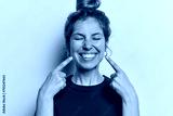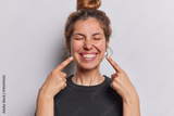Photo of pleasant looking cheerful woman points index fingers at toothy smile shows wwell cared whie even teeth dressed in casual black t shirt isolated over whtie studio background feels happy