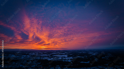 Afterglow over Dramatic Sky at Sunrise. Colorful sky at dawn with a serene and scenic landscape. Cityscape at Sunset with Beautiful Sky and Urban Landscape