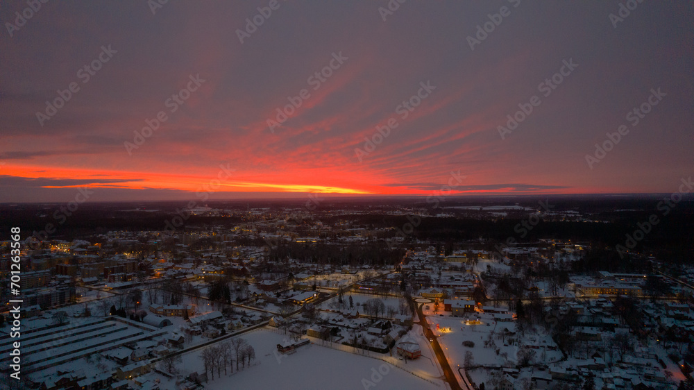Afterglow over Dramatic Sky at Sunrise. Colorful sky at dawn with a serene and scenic landscape. Cityscape at Sunset with Beautiful Sky and Urban Landscape
