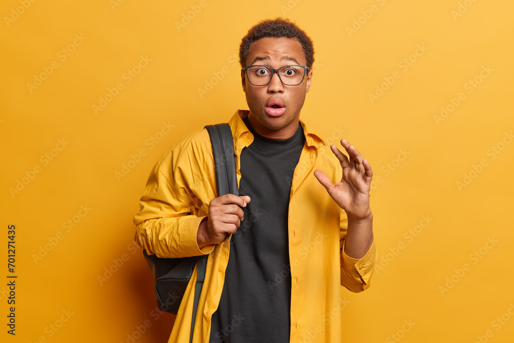 People and reactions concept. Speechless dark skinned man holds breath and reacts to something scarying wears transparent eyeglasses shirt carries backpack on shoulder isolated on yellow background