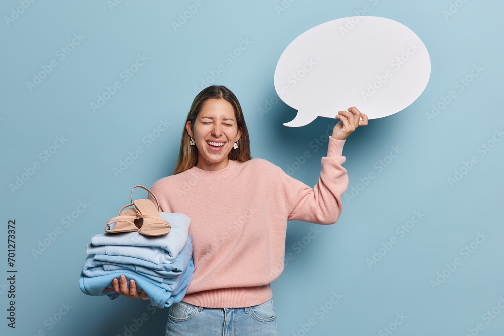 Overjoyed European woman with long hair toothy smile laughs happily holds folded clothes and sandals holds communication bubble for your promotional content isolated over blue studio background