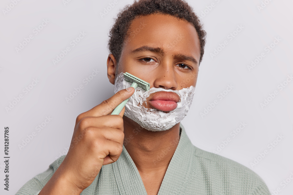 Indoor shot of dark skinned man with short curly hair shaves his beard with razor looks attentively at camera wears comfortable dressing gown isolated over white background. Hygiene procedures