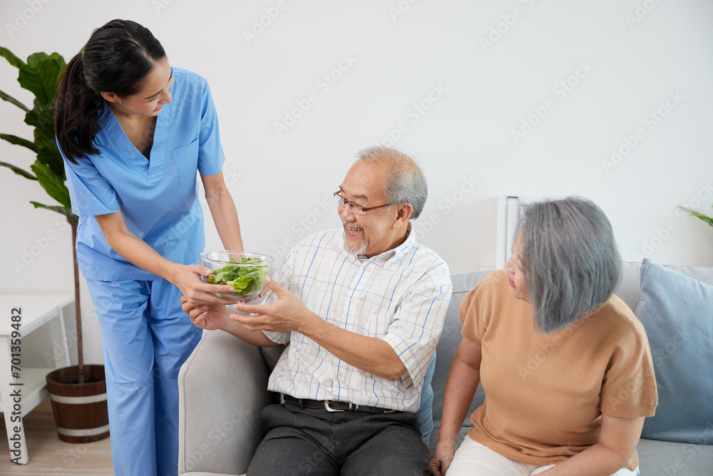 nurse or caregiver serving vegetables in a bowl to senior couple on sofa