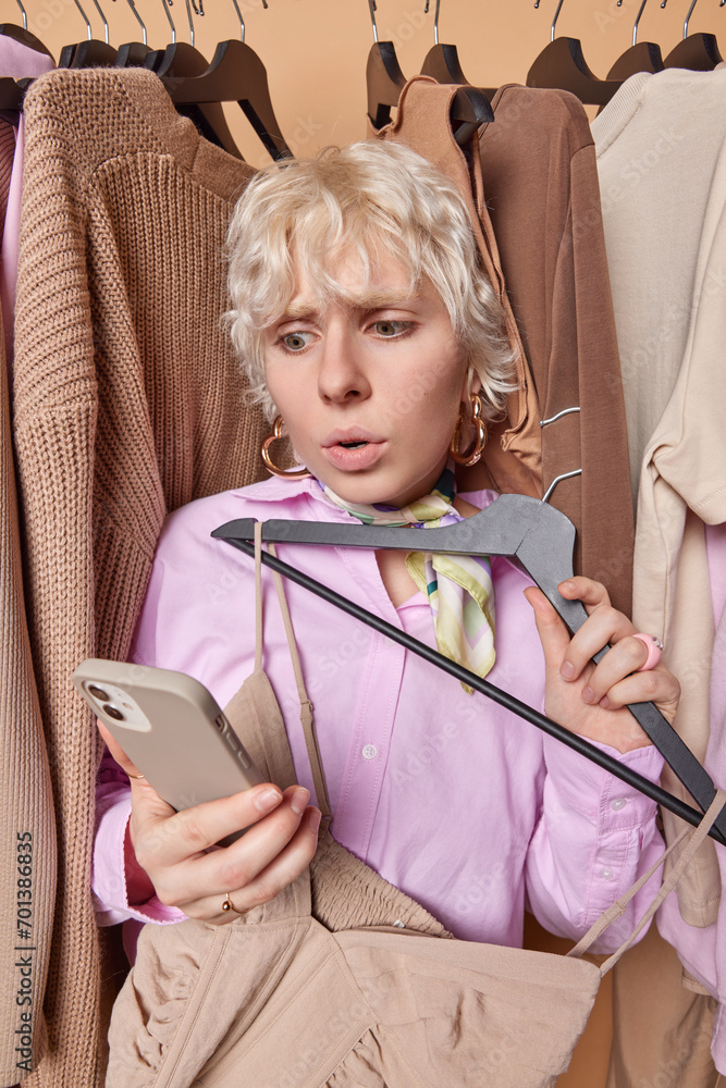 Shopping concept. European lady with short blonde hair weaing purple blouse standing in rail with different clothes holding rack with beige dress choosing clothes online on smartphone. Shopaholic