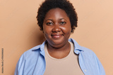 Portrait of pleasant looking curly haired chubby young African woman with curly hair dressed casually poses satisfied against brown background makes photo. People ethnicity and emotions concept