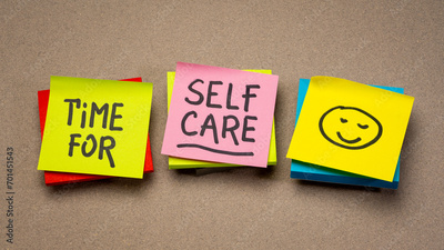 time for self care inspirational reminder - handwriting on sticky notes, body positive, mental health and personal development concept