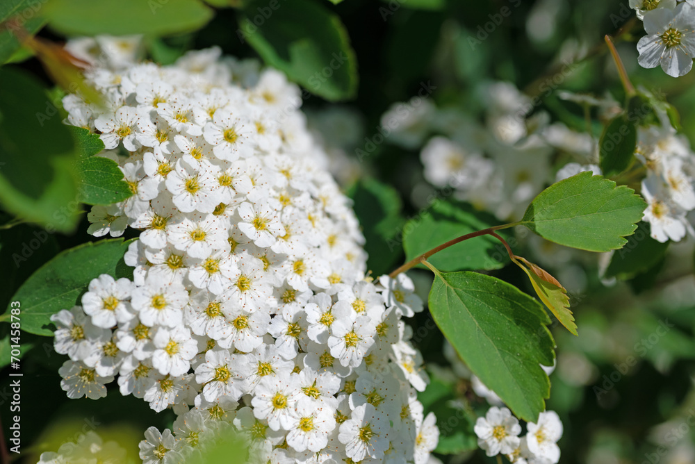 Blühender Spierstrauch, Spiraea, im Frühling