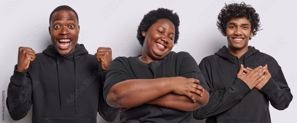 Happy overweight woman embraces herself being body positive pose between twom men who clench fists from triumph and make heart gesture dressed in casual black clothing isolated over white background