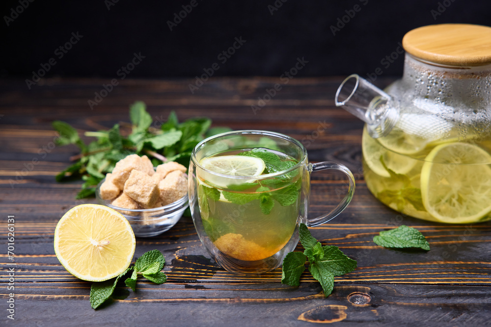 natural organic herbal tea with lemon and mint in glass teapot on a wooden table