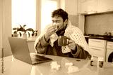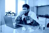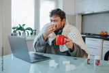 Homebound Flu Relief Young Man in Duvet Shivers and Wipes Nose on Kitchen Chair