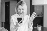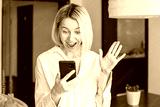 Attractive middle-aged 40s woman looking at her smart phone and smiling while standing at home