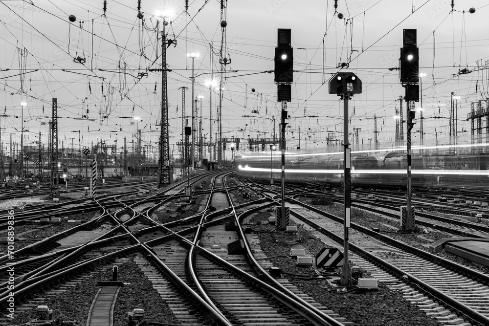 Railway infrastructure at Frankfurt main station, Germany. Black and white panorama. Technology with signals, crossings, catenary, tracks, switches at twilight. Blurred fast train lights in motion.