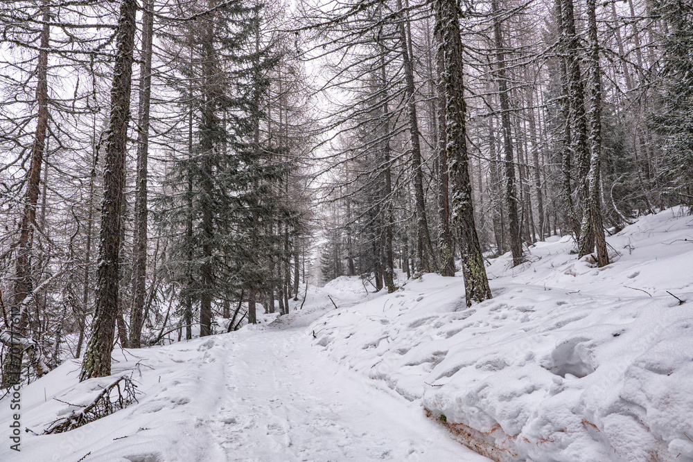 Snowy landscape in a forest of the Italian alps during a snowfall