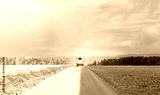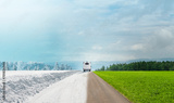 Camper auf einer Strasse im winter mit Schnee und im Sommer