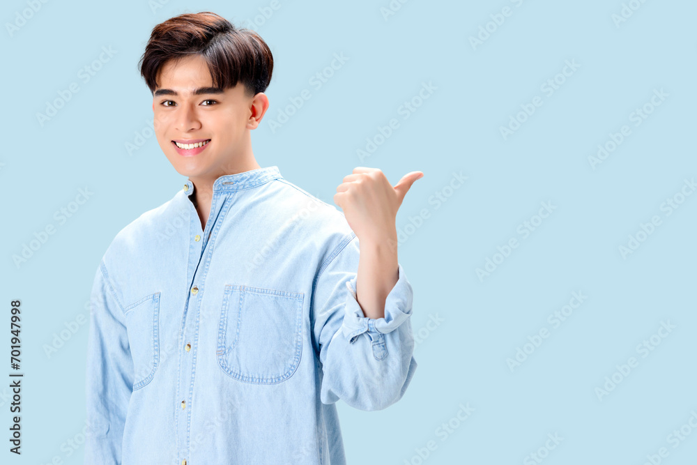 Happy young Asian smart man pointing thumb to copy space over isolated blue background.