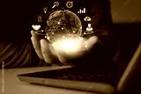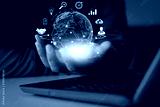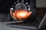 Digital marketing, global business concept. Businessman using laptop computer with internet network connection technology solution, market online communication. Financial and banking, big data tech.